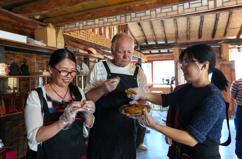 袁云(右)在自己的烘焙店內(nèi)向王伶(左)和她的愛(ài)人(中)分享店鋪制作的中秋月餅(9月15日攝)。新華社記者陳欣波 攝