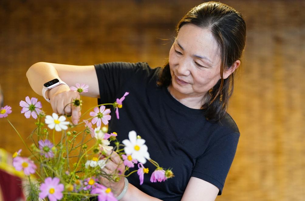 來(lái)自湖南的周女士在位于土瓜沖村的旅居房?jī)?nèi)打理采摘的野花(9月15日攝)。新華社記者陳欣波 攝
