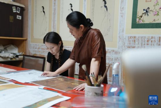 9月25日,在“觀繡園”傳習(xí)所內(nèi),盧建英(右)在向女兒潘乃舒講解勾線方法。