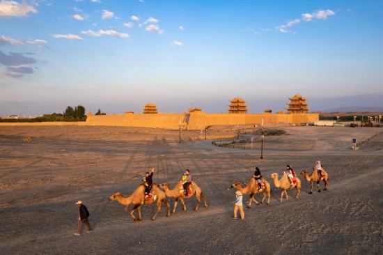 7月15日,游客在嘉峪關(guān)關(guān)城旁騎駱駝游覽(無人機照片)。新華社記者郎兵兵 攝