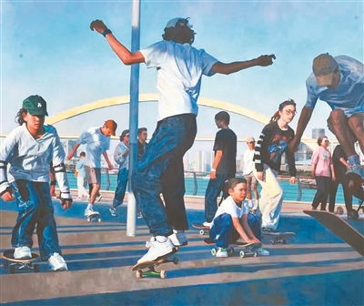 油畫(huà)《悅動(dòng)青春》《茶園派對(duì)》《追夢(mèng)人》等通過(guò)描繪城市青年人的動(dòng)感瞬間,表現(xiàn)快節(jié)奏城市生活中的青春能量?!稅倓?dòng)青春》描繪了已深入城市眾多角落、鍛煉兼娛樂(lè)的滑板運(yùn)動(dòng),動(dòng)感十足;《茶園派對(duì)》中,年輕人在臨時(shí)搭建的茶園帳篷里盡情歌唱;《追夢(mèng)人》中,青年們?cè)谏碁┥巷w奔跳躍,他們飛揚(yáng)的姿態(tài)傳遞出青春的活力。