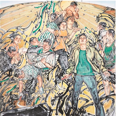 80后沈曉明是中國(guó)美術(shù)學(xué)院中國(guó)畫(huà)學(xué)院在讀博士研究生。他參展的中國(guó)畫(huà)《金色土地》采用金字塔構(gòu)圖,并對(duì)寫(xiě)意筆墨進(jìn)行探索,讓人眼前一亮。他說(shuō):“這幅作品畫(huà)的是耕作和養(yǎng)育我們的土地。我沒(méi)有畫(huà)一個(gè)具體時(shí)空中的生產(chǎn)或生活場(chǎng)景,而是把所見(jiàn)到的身處不同時(shí)、在土地上耕作和生活的人疊合在一起,形成了意象化的中國(guó)人群像?!?/p>