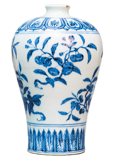 青花瓷是明清瓷器的代表產(chǎn)品。明永樂年間的青花折枝花果紋瓷梅瓶,使用進口的“蘇麻離青”繪制,釉色青翠濃艷。這件瓷器是景德鎮(zhèn)御窯廠燒制的宮廷用器,代表了當(dāng)時制瓷業(yè)的最高水平。