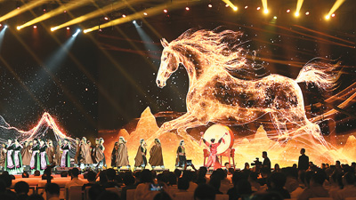 在新疆民歌《青春舞曲》的旋律中,身著維吾爾族服飾的表演者們手持果盤、載歌載舞,帶來了夏日新疆的陽光與青春。在《我的祖國》的悠揚(yáng)旋律中,舞臺(tái)上五扇金色的書型大門緩緩開啟,東鄉(xiāng)族翻譯家艾布等5位駿馬獎(jiǎng)翻譯獎(jiǎng)得主來到舞臺(tái)中央。艾布把曾獲第十二屆駿馬獎(jiǎng)的廣西瑤族作家紅日的長(zhǎng)篇小說《駐村筆記》翻譯成維吾爾語,原著與譯著獲同一殊榮,在該獎(jiǎng)評(píng)獎(jiǎng)歷史上還是第一次。兩本書的創(chuàng)作和翻譯故事通過活動(dòng)被更多人所知。本屆盛典與電視晚會(huì)和網(wǎng)絡(luò)平臺(tái)直播充分融合,展現(xiàn)民族文學(xué)發(fā)展成就,助力文學(xué)“破圈”傳播。