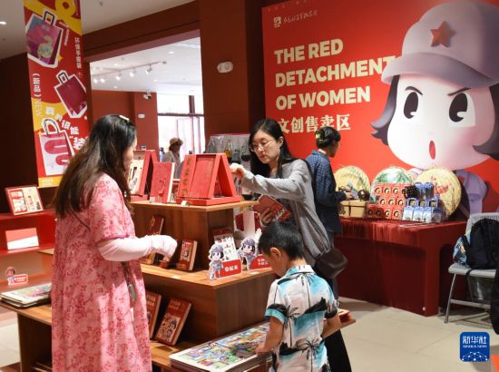 游客在紅色娘子軍紀(jì)念園內(nèi)挑選“小瓊花”文創(chuàng)產(chǎn)品。新華社記者劉鄧 攝
