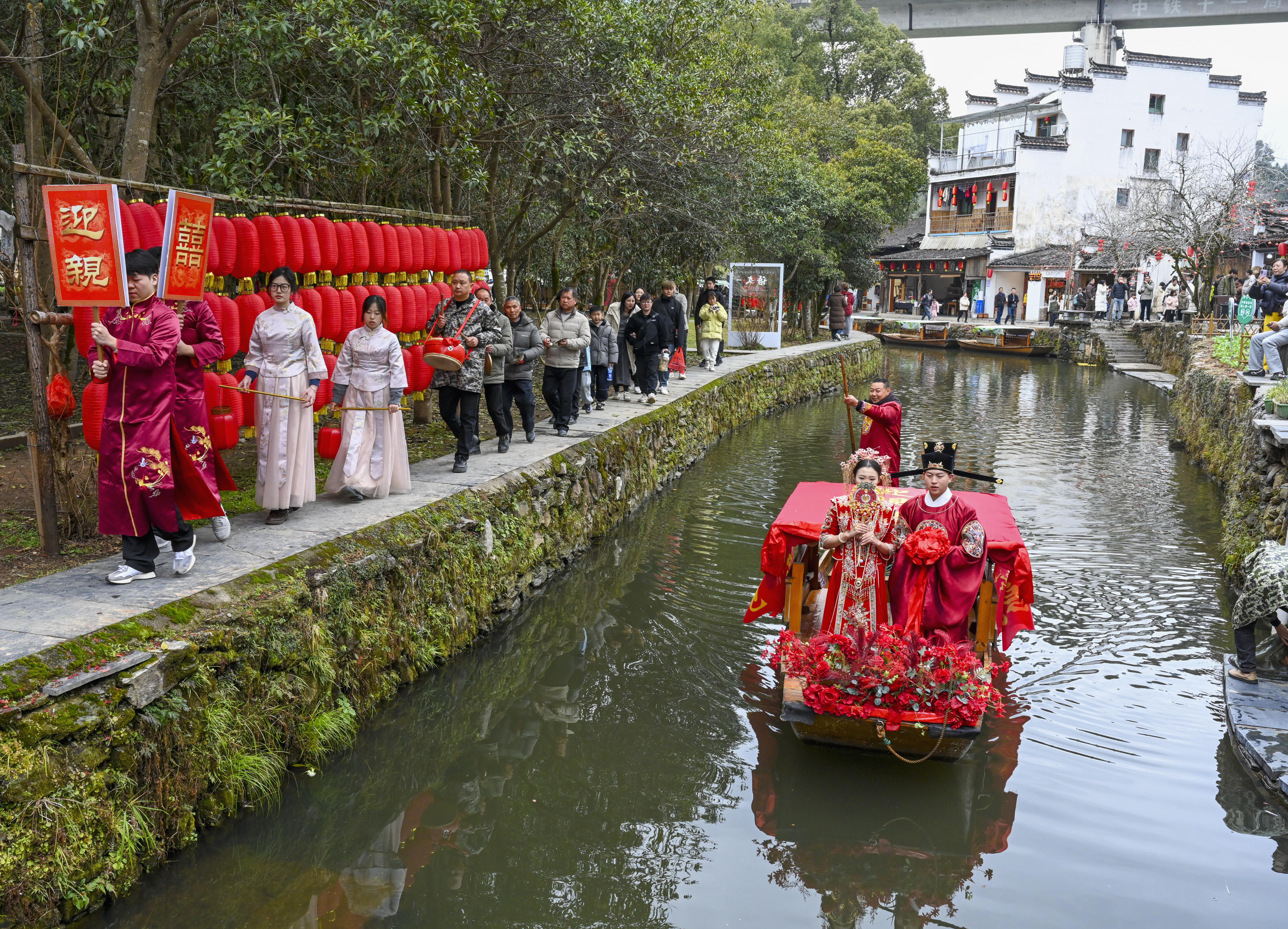 近日,在婺源縣秋口鎮(zhèn)李坑村河面喜慶的婚船上,一對(duì)新人身著明制婚服,立于船上進(jìn)行沿河巡游。這場(chǎng)盛大的宋韻水上婚禮表演,吸引了眾多游客駐足觀禮、歡聲祝福。
