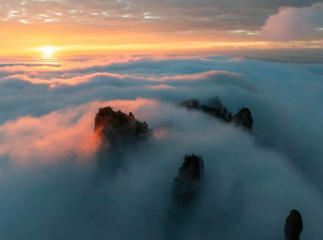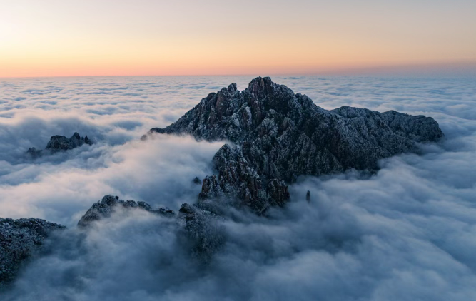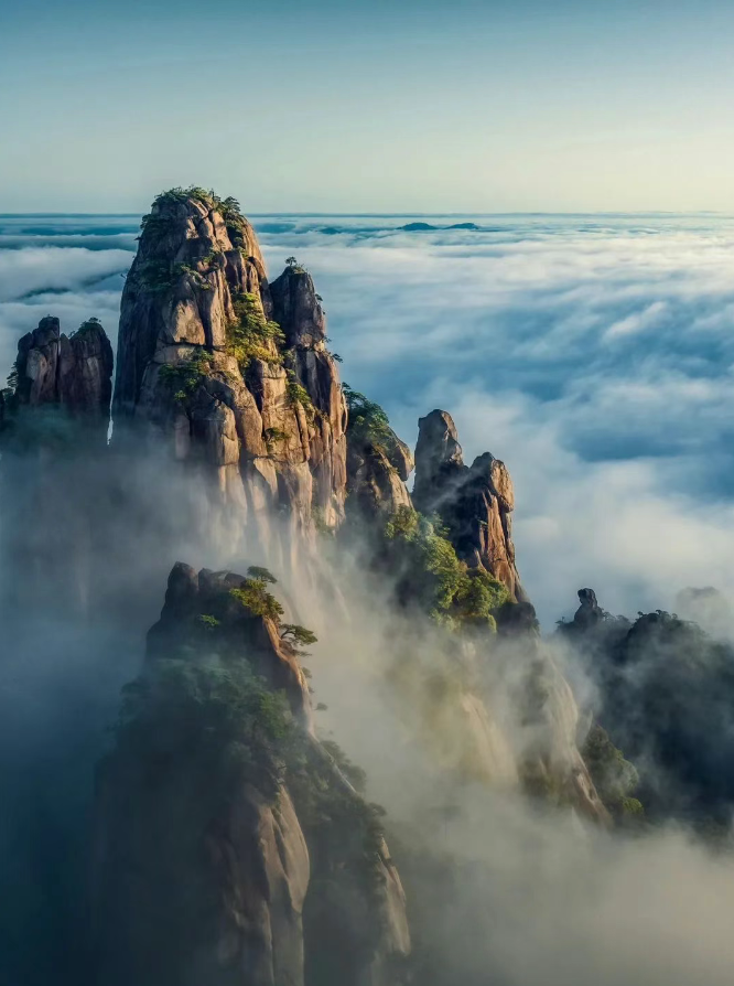 它們從山谷涌出,裹著松針的清香,漫過(guò)花崗巖的棱角,把千仞絕壁變成一座座孤島。山成了云中的鯨,在乳白的海浪里游弋,脊背時(shí)隱時(shí)現(xiàn),驚起一片驚嘆的漣漪。