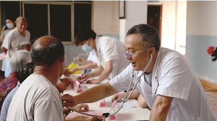 6月24日,萬年縣衛(wèi)健部門志愿者在青云敬老院向老人宣傳健康知識。連日來,該縣各級醫(yī)護志愿者走進敬老院、走進社區(qū)、走進鄉(xiāng)村,為老人提供健康體檢,進行健康知識宣傳,把關(guān)愛送給老人們。趙德穩(wěn) 攝