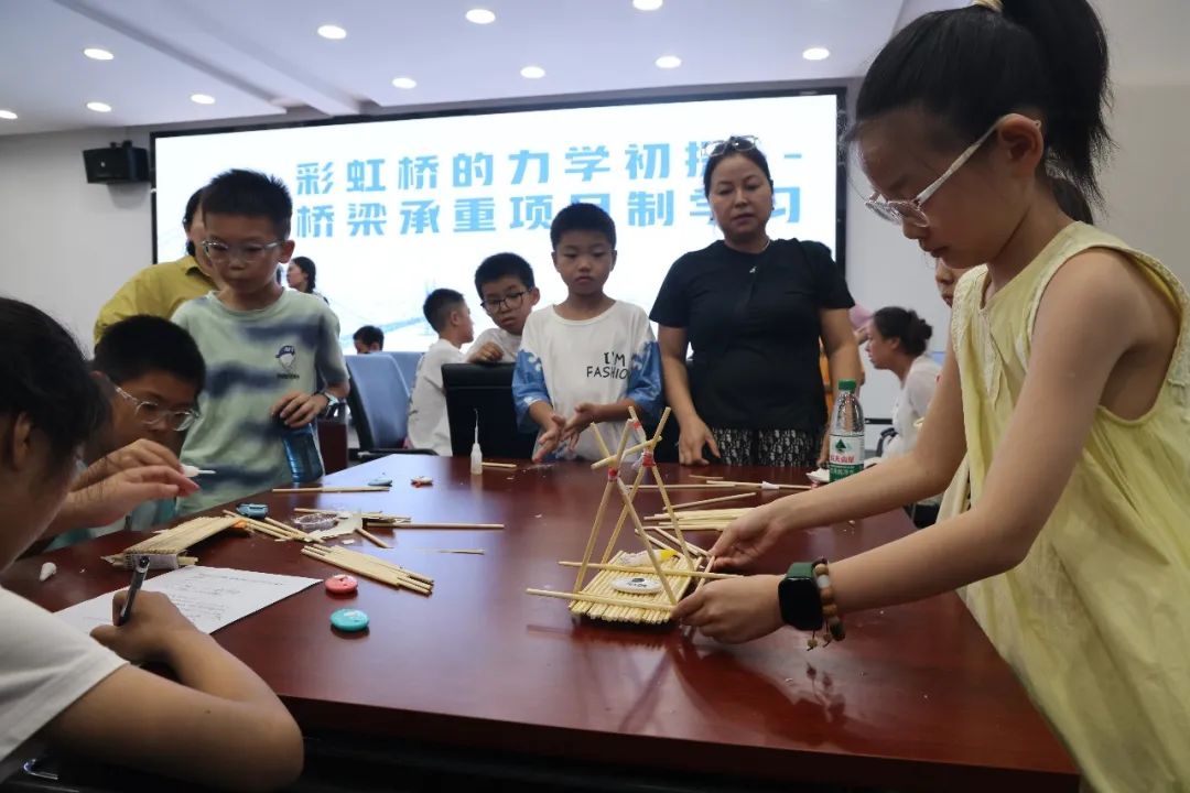 活動現(xiàn)場,學(xué)生們以一次性筷子作為材料,分組合作,自主設(shè)計(jì),共同搭建,將學(xué)習(xí)到的力學(xué)知識轉(zhuǎn)換為橋梁搭建的實(shí)踐經(jīng)驗(yàn)。“我們希望通過橋梁承重這樣的項(xiàng)目,讓孩子從‘看科學(xué)’變成‘做科學(xué)’。用簡單材料實(shí)現(xiàn)科學(xué)原理,在孩子們親手搭建、測試、改進(jìn)的過程中,培養(yǎng)他們的觀察能力和解決問題的思維,這比單純講理論更有效。”陳俊表示。