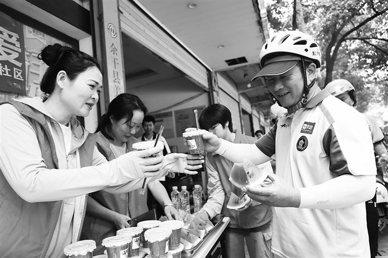 7月17日,余干縣城市社區(qū)管委會(huì)南門社區(qū)黨員志愿者為一線外賣員、環(huán)衛(wèi)工人送上冰鎮(zhèn)西瓜和綠豆湯。