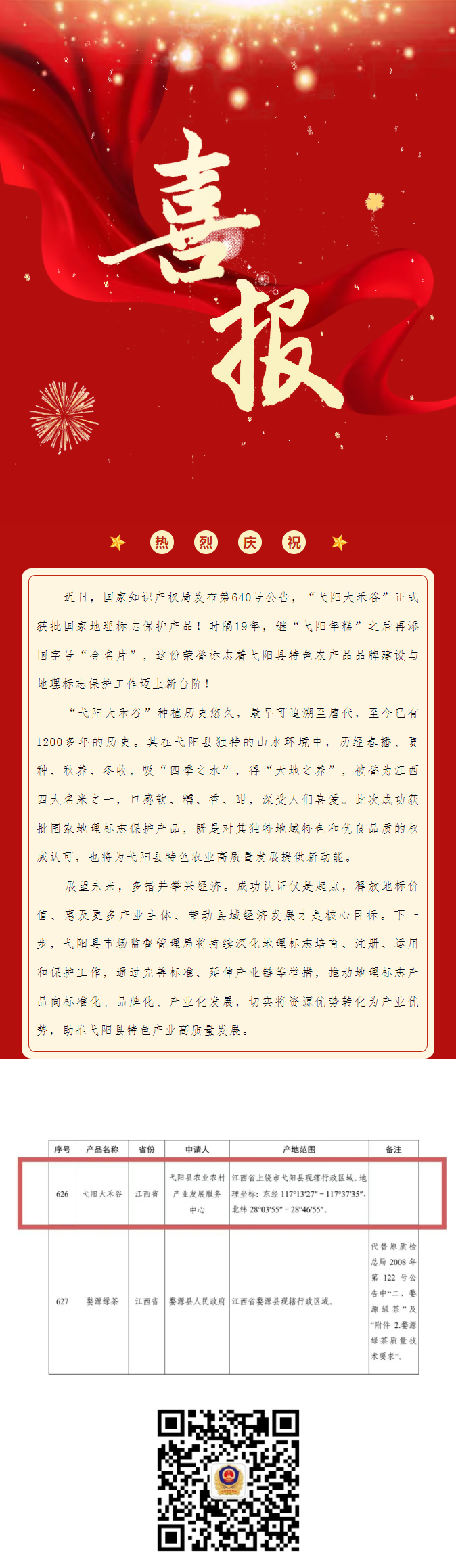 喜訊!“弋陽(yáng)大禾谷”獲批國(guó)家地理標(biāo)志保護(hù)產(chǎn)品!