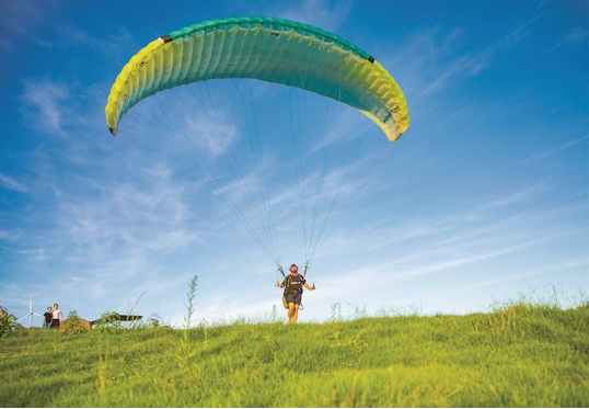 8月8日,位于橫峰縣葛源鎮(zhèn)的米頭尖滑翔傘基地,吸引了眾多游客前來(lái)打卡體驗(yàn)。游客們可在此與白云相擁、與山野對(duì)話,從空中俯瞰峰林景觀,感受低空飛行的獨(dú)特魅力。