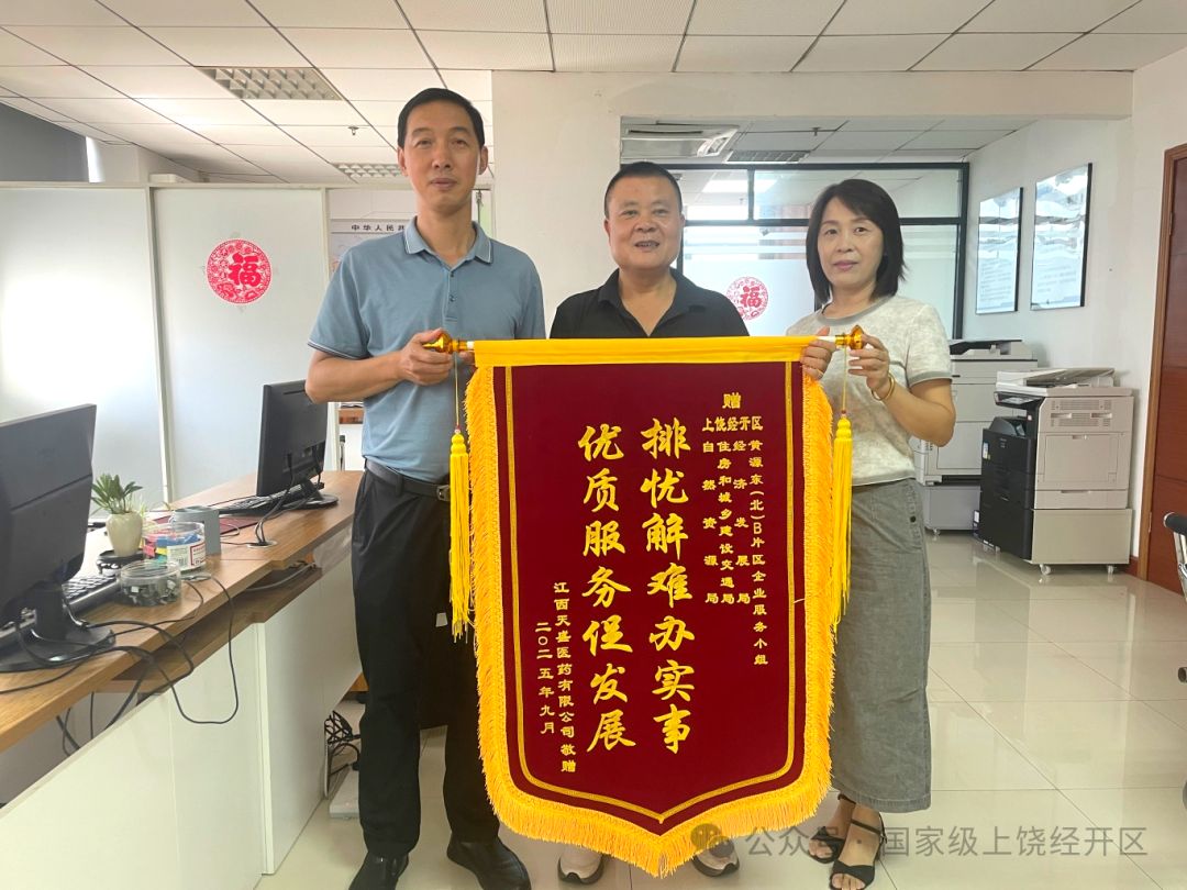“非常感謝你們的高效服務(wù),為我們解決了多年來(lái)的難題,也讓我們企業(yè)發(fā)展更有信心了?!?月25日,江西天盛醫(yī)藥有限公司負(fù)責(zé)人來(lái)到上饒經(jīng)開(kāi)區(qū),鄭重地將一面印有“排憂解難辦實(shí)事,優(yōu)質(zhì)服務(wù)促發(fā)展”的錦旗送到了區(qū)經(jīng)發(fā)局、住建交局、自然資源局和片區(qū)企業(yè)服務(wù)小組干部的手中。