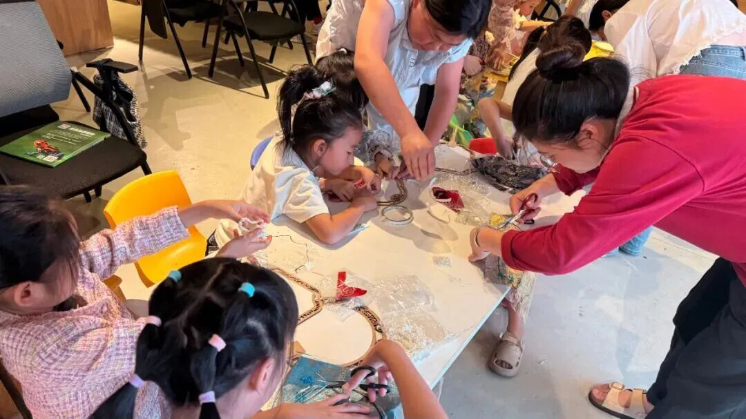 圓形扇框、五彩斑斕的宋錦布片、晶瑩珍珠以及膠水、剪刀……材料剛一發(fā)到手中,孩子們就躍躍欲試。原本興奮雀躍的他們,在工作人員的耐心引導(dǎo)下很快靜下心來,一雙雙小手認真裝點起自己的團扇。“先把宋錦布料平整地貼在扇框上,注意邊角要對齊!”“珍珠可以拼成你喜歡的小花、星星,大膽試試吧!”工作人員穿梭在孩子中間,不時俯身指導(dǎo)。