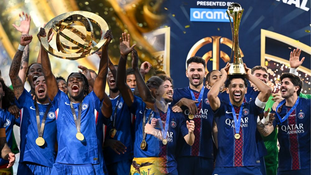 拼版照片:左圖為切爾西隊在2025年世俱杯上捧起獎杯(新華社記者 吳曉凌 攝);右圖為巴黎圣日耳曼隊在洲際杯奪得冠軍(新華社發(fā),尼庫攝)。