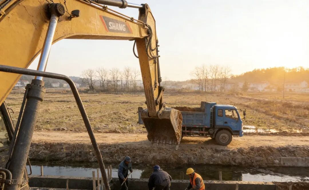 冬日暖陽下,玉山縣四股橋鄉(xiāng)四股橋村的高標(biāo)準(zhǔn)農(nóng)田建設(shè)現(xiàn)場一派熱火朝天的繁忙景象。挖掘機鐵臂揮舞,來回穿梭平整土地;工程車輛滿載砂石水泥,駛向田間道路修建點位;工人們正忙著襯砌灌溉水渠,一條條筆直的溝渠在田野間延伸,勾勒出穩(wěn)產(chǎn)高產(chǎn)的希望輪廓。