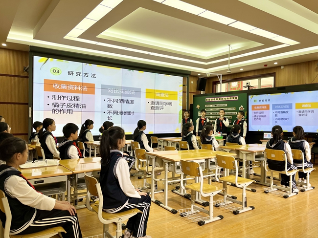 在活動上,科技教師帶領學生圍繞“校園綠色能源的可持續(xù)發(fā)展”小課題課程進行匯報,同學們分小組分享了利用雞蛋殼做肥料給小雞補鈣、橘子皮精油的探究與制作、利用剩菜剩飯進行堆肥等研究成果。