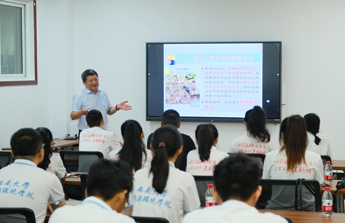 ??全國高校黃大年式教師團隊負(fù)責(zé)人謝德體向服務(wù)團成員講授侯光炯院士的奉獻精神。