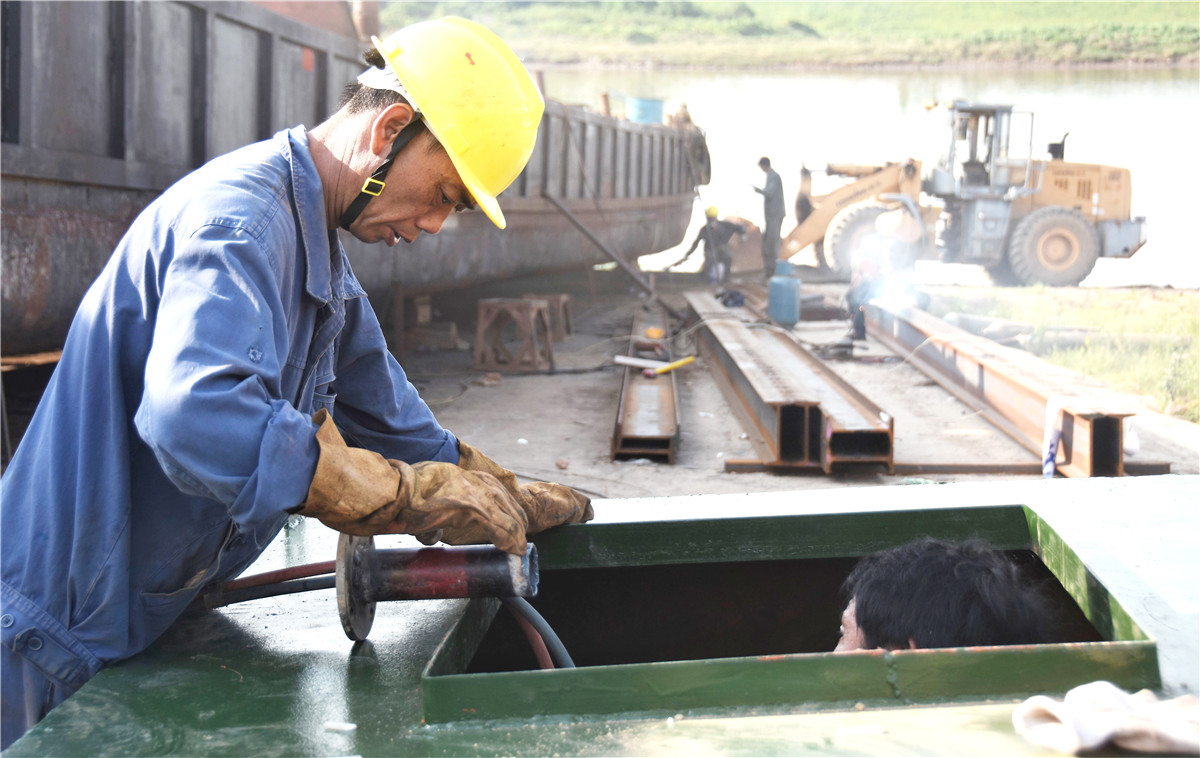 7月13日,鄱陽縣饒河船舶修理廠工人正在加緊修理船舶。進(jìn)入“三伏”天,室外氣溫不斷攀升,給戶外工作生產(chǎn)帶來困難,為了盡快修復(fù)船舶,工人們利用早晚錯(cuò)峰維修。