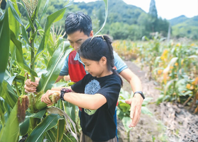 在諸暨市馬劍鎮(zhèn)狀元村,孩子在農(nóng)田里采收玉米,體驗農(nóng)事。
