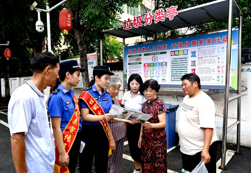 為提升城鄉(xiāng)環(huán)境品質(zhì),萬年縣大力實(shí)施垃圾分類管理,通過宣傳教育,增強(qiáng)居民環(huán)境保護(hù)意識(shí),做到垃圾標(biāo)準(zhǔn)化回收,促進(jìn)城鄉(xiāng)生態(tài)文明建設(shè)。圖為8月15日,該縣城市管理綜合行政執(zhí)法大隊(duì)的志愿者來到陳營(yíng)鎮(zhèn),向居民宣傳垃圾分類知識(shí)。趙德穩(wěn) 攝