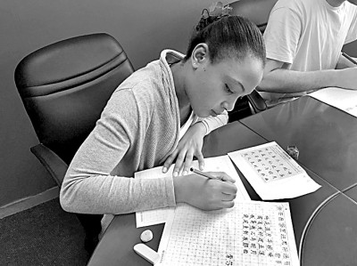 在南非德班理工大學(xué)孔子學(xué)院組織的漢字書寫大賽中,學(xué)員李莎正在書寫中國(guó)古典詩(shī)詞。孔子學(xué)院供圖