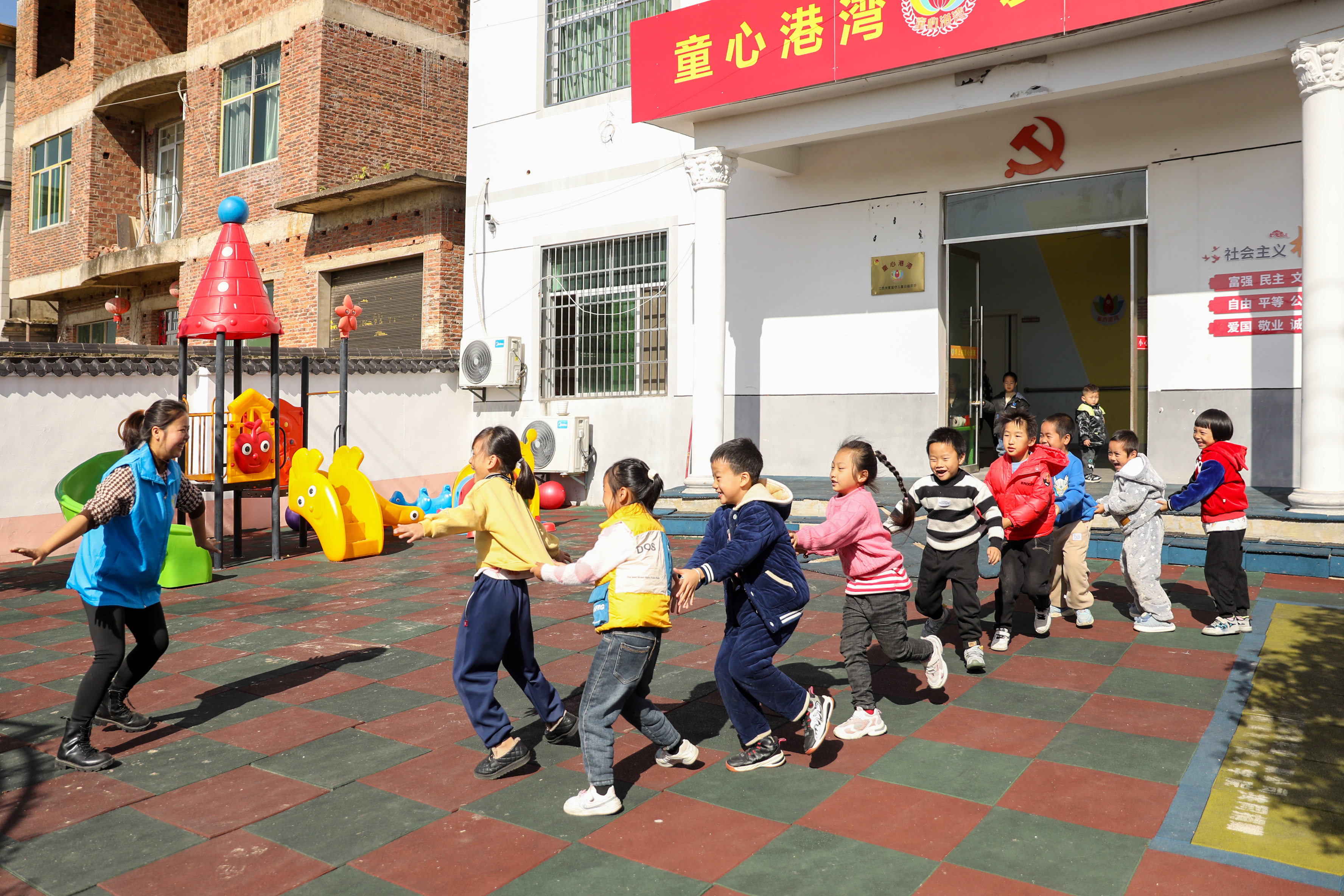 11月18日,萬年縣珠田鄉(xiāng)坪上村童心港灣里,童伴媽媽正跟孩子們一起做游戲。為加強對農(nóng)村留守兒童的關(guān)心關(guān)愛,打造農(nóng)村留守兒童“溫暖家園”,萬年縣在全縣范圍內(nèi)打造了9個童心港灣,服務(wù)留守兒童200余名。徐聲高 攝