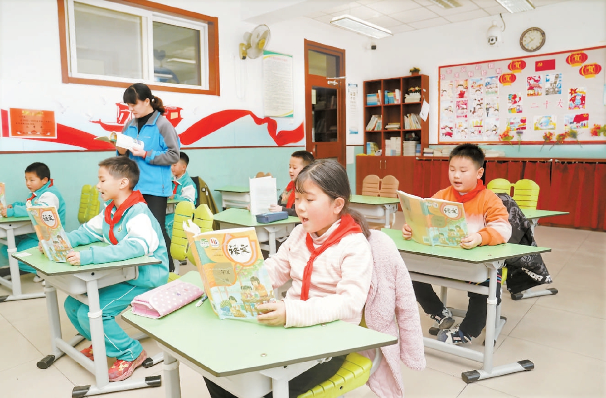 ??今天上午,門頭溝區(qū)大臺中心小學三年級學生在老師帶領(lǐng)下朗讀課文。昨天,門頭溝區(qū)大臺中心小學及附屬幼兒園恢復原址辦學,96名師生重返校園?!案卸鳌焙汀傲⒅尽背蔀榉敌5谝徽n的主題詞。記者 王海欣 攝