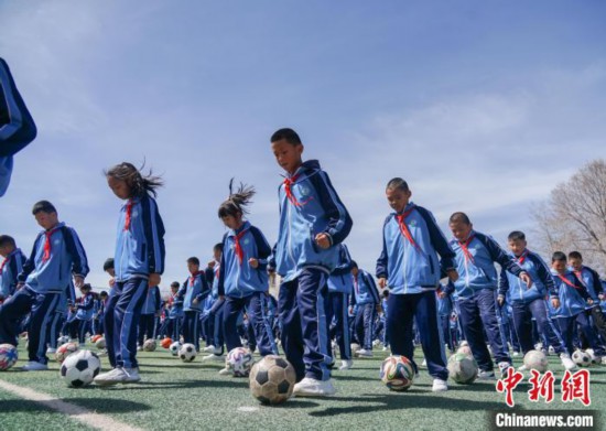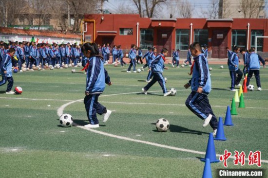 圖為在西寧市大堡子小學(xué),學(xué)生進(jìn)行足球特色大課間展示。馬銘言 攝
