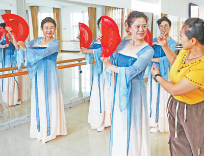 內(nèi)蒙古自治區(qū)呼倫貝爾市扎蘭屯市老年活動(dòng)中心,幾名學(xué)員在老年大學(xué)上舞蹈課。