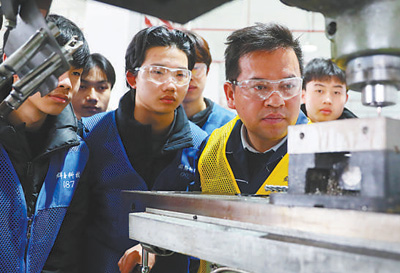 湖南省永州市新田縣產(chǎn)業(yè)開發(fā)區(qū),新田縣職業(yè)中等專業(yè)學(xué)校學(xué)生在學(xué)習(xí)機(jī)床操作技術(shù)。