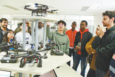 江蘇大學(xué)第四屆計(jì)算機(jī)文化節(jié)上,外國(guó)留學(xué)生在了解無(wú)人機(jī)功能和運(yùn)行原理。