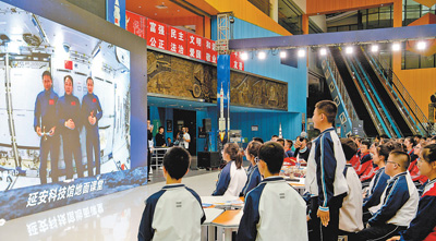 陜西延安科技館“天宮課堂”第四課地面課堂,學(xué)生在向航天員提問。