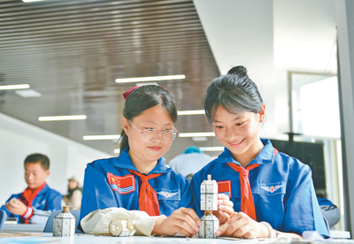 近日,山東省日照市東港區(qū)的天勰力航天科普教育基地,學(xué)生在體驗(yàn)“日照三號(hào)”仿真衛(wèi)星組裝。學(xué)生通過模擬體驗(yàn),感受科技魅力,點(diǎn)燃航天夢(mèng)想。