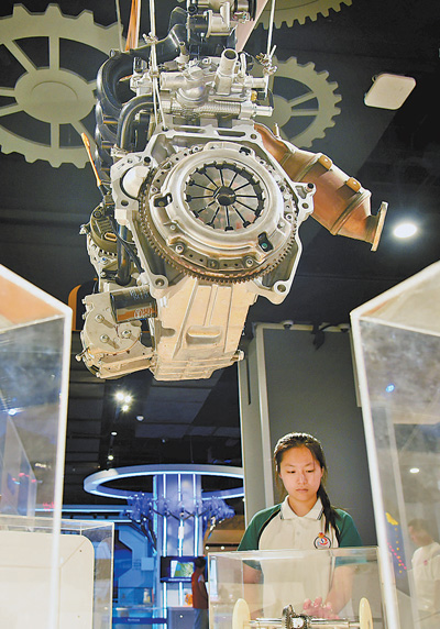 7月7日,一名中學生在山東省棗莊市科技館了解內(nèi)燃機工作原理。 劉明祥攝(新華社發(fā))