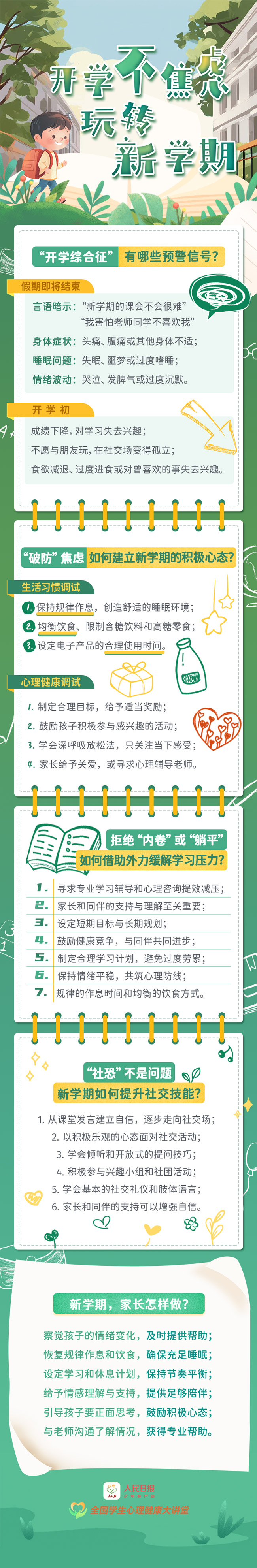 進入開學倒計時,孩子出現(xiàn)情緒低落、身體不適,還常把“不想上學”掛在嘴邊……這些都是“開學綜合征”的預(yù)警信號。面對新學期的挑戰(zhàn),孩子如何調(diào)整心態(tài)?家長如何應(yīng)對?心理健康專家來支招,帶你玩轉(zhuǎn)新學期。