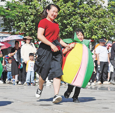 福建泉州安溪縣第十四幼兒園,家長與孩子參加親子體育活動。