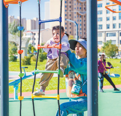 內(nèi)蒙古呼和浩特萬和體育公園,家長幫助孩子攀爬軟梯。