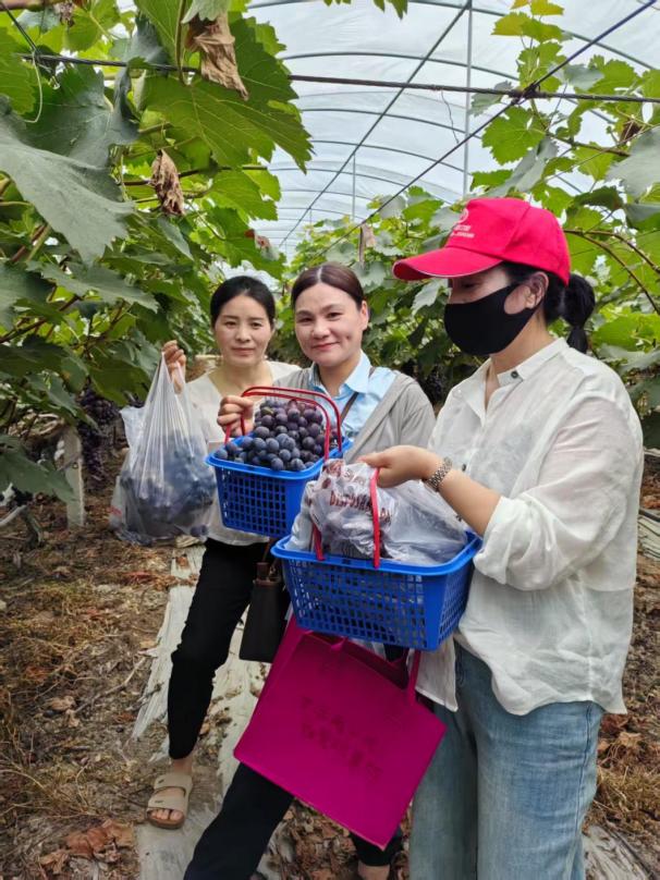 活動現(xiàn)場,職工們穿梭于果樹間,踮腳、伸手、采摘,動作嫻熟而歡快,歡聲笑語此起彼伏。大家一邊采摘一邊品嘗,還不忘相互分享:“這果子真甜,比超市買的好吃多了!”大家紛紛拿著籃子,精心挑選著新鮮的葡萄,感受著豐收的喜悅。