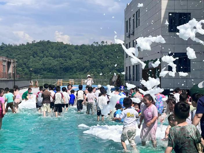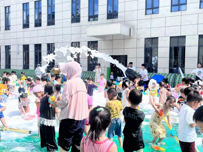 孩子們迫不及待地開啟這場(chǎng)清涼之旅。隨著動(dòng)感音樂響起,奧特曼哥哥閃亮登場(chǎng)與小朋友一起互動(dòng),同時(shí)大大的泡沫機(jī)全力運(yùn)作著,泡沫瞬間鋪滿整個(gè)場(chǎng)地,營(yíng)造出一個(gè)夢(mèng)幻的童話世界。小朋友們興奮地在泡沫中奔跑、嬉戲,有的用手捧起泡沫,感受其柔軟觸感。有的躺在泡沫里,愜意享受這份清涼。還有的小朋友打起了激烈的水槍大戰(zhàn),你來我往,水花四濺,歡笑聲、尖叫聲回蕩在幼兒園的每一個(gè)角落。