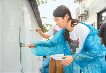 在浙江省湖州市德清縣舞陽(yáng)街道上柏村,來自華東理工大學(xué)藝術(shù)設(shè)計(jì)與傳媒學(xué)院暑期研學(xué)團(tuán)的學(xué)生正在手繪創(chuàng)意墻畫,扮靚鄉(xiāng)村環(huán)境。