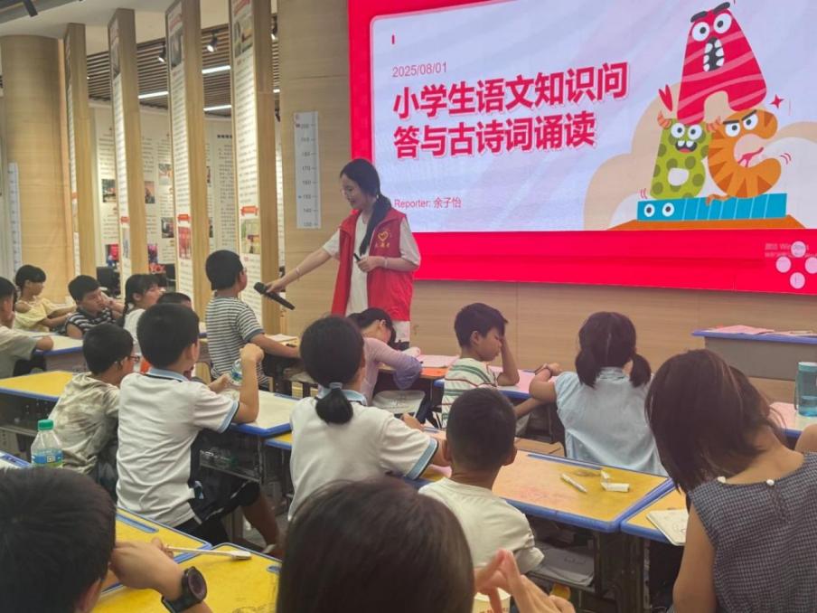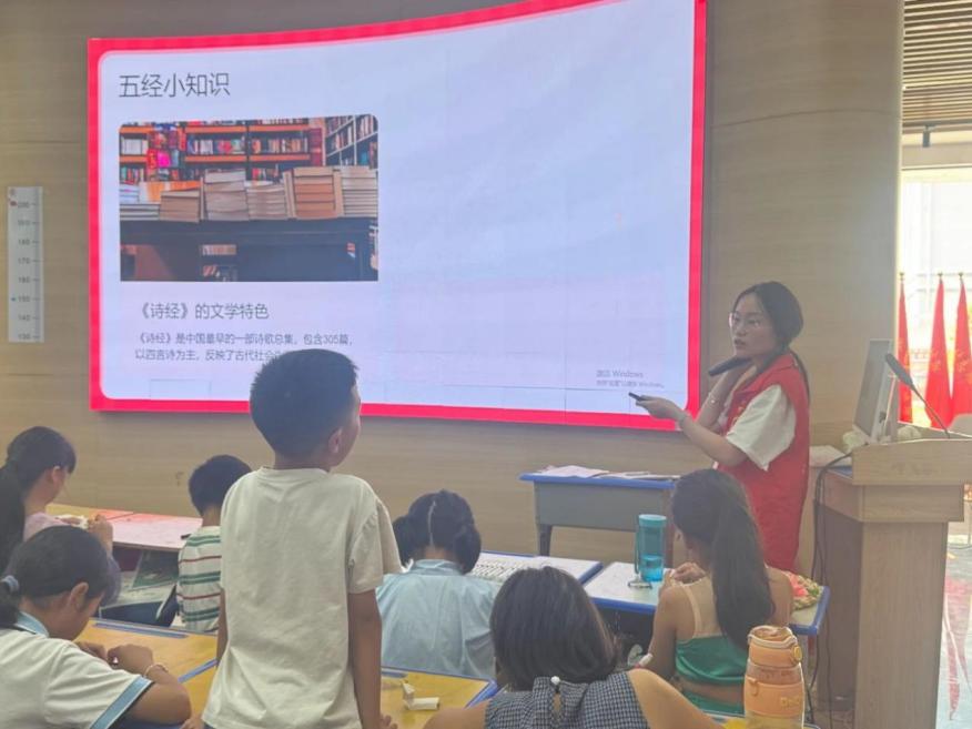 8月1日,志愿者余子怡老師以語文知識競答開啟傳統(tǒng)文化課堂。從李白《靜夜思》的鄉(xiāng)愁意境講起,孩子們跟隨詩句遙望“明月光”、輕吟“思故鄉(xiāng)”,在朗誦中感受古詩韻律之美。課堂深入淺出拓展至“五經(jīng)”知識,老師用“《詩經(jīng)》是古代民歌集,《尚書》記治國智慧”等形象比喻,將厚重典籍轉(zhuǎn)化為易懂故事。孩子們踴躍參與“詩詞接龍”和經(jīng)典常識問答,一名學(xué)生現(xiàn)場模仿詩人捋須吟誦,引得滿堂歡笑。
