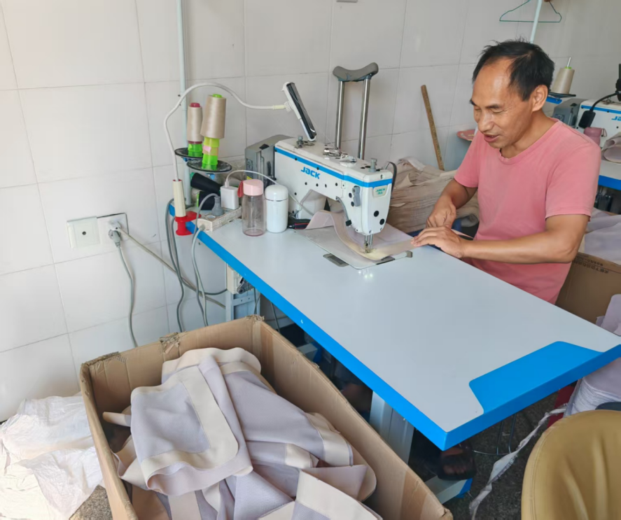 當(dāng)縫紉機(jī)送到家時(shí),他輕輕踩下踏板,熟悉的“嗡嗡”聲響起,積壓多日的愁云一下子散了。“剛開始做簡(jiǎn)單的箱包縫合,一天能做幾十個(gè),按件算錢,一個(gè)月下來能有兩千多元收入?!鼻癖χf,現(xiàn)在訂單穩(wěn)定,他越做越熟練,收入比在浙江打工時(shí)還高些。