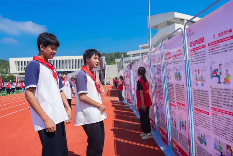 在“法治簽名”環(huán)節(jié),同學(xué)們有序在主題橫幅上簽下自己的名字,以簽名的形式承諾遵守法律、踐行法治,讓法治信念通過筆尖深深烙印在心中。簽名儀式后,“法治探索之旅”觀看展覽活動同步開展。現(xiàn)場設(shè)置的六大主題板塊、60 塊展板,以圖文并茂的形式將抽象的法律條文轉(zhuǎn)化為通俗易懂的“青春守護(hù)指南”,涵蓋反詐知識、權(quán)益保護(hù)、行為規(guī)范等多個方面,同學(xué)們在參觀過程中不時駐足討論,進(jìn)一步加深了對法律知識的理解與記憶。