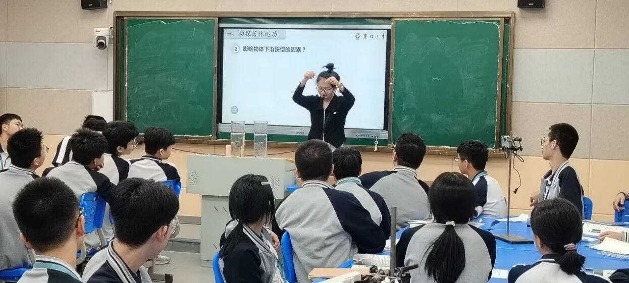 巧用信息技術(shù),化解抽象難點(diǎn)。王墅老師執(zhí)教課題為《自由落體運(yùn)動(dòng)》,她的課堂兼具趣味性與挑戰(zhàn)性,以“名偵探柯南破解高空墜物案件”開場(chǎng),迅速激發(fā)學(xué)生探究欲望。隨后通過改變介質(zhì)阻力系數(shù)、演示牛頓管實(shí)驗(yàn),引導(dǎo)學(xué)生逐步探究自由落體運(yùn)動(dòng)規(guī)律。課堂中,她充分運(yùn)用多媒體動(dòng)畫與仿真軟件,將物體下落過程可視化、動(dòng)態(tài)化,讓原本難以直觀觀察的物理量變得清晰易懂,成功化解教學(xué)抽象難點(diǎn)。
