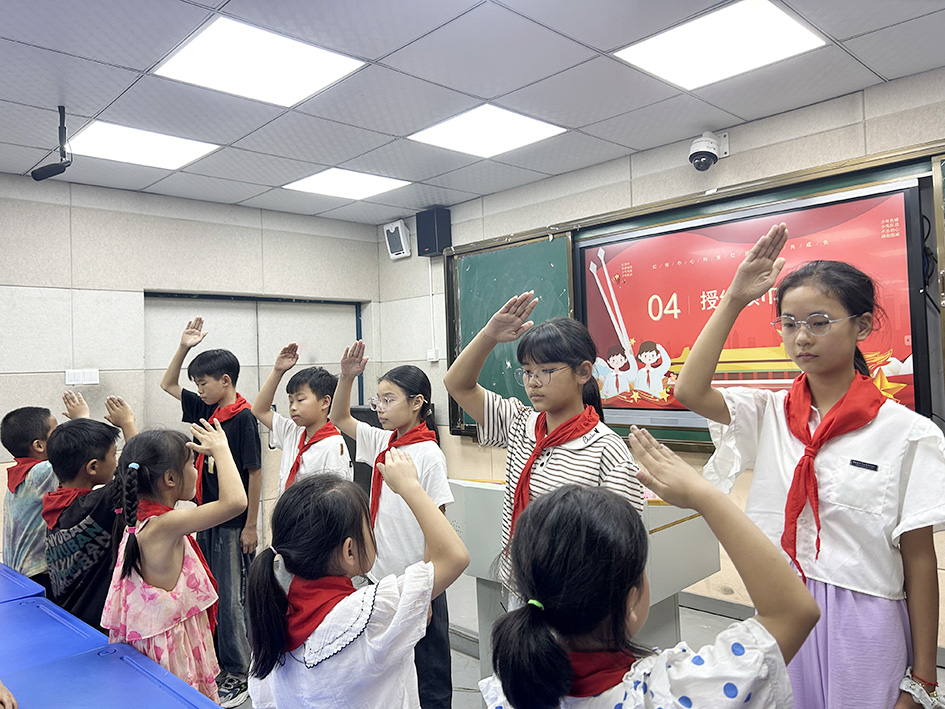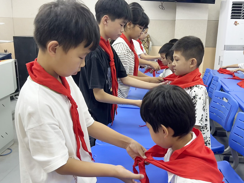 在莊重的入隊儀式上,老隊員為新隊員佩戴紅領(lǐng)巾,鮮艷的領(lǐng)巾在胸前飄揚,新隊員面向隊旗莊嚴宣誓,稚嫩的聲音堅定有力?;鸺t的隊旗見證著新一代少年的成長誓言。