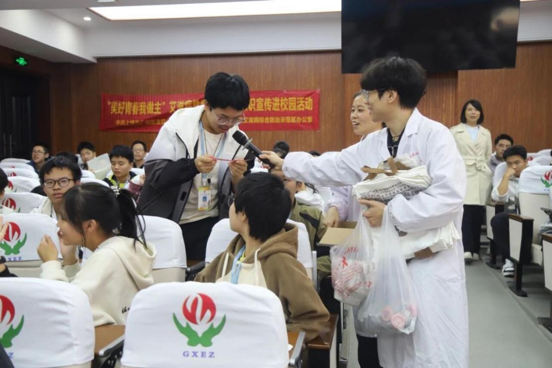 互動(dòng)問(wèn)答環(huán)節(jié)氣氛熱烈,同學(xué)們踴躍舉手提問(wèn),區(qū)皮防所工作人員即時(shí)答疑解惑、糾正認(rèn)知偏差,推動(dòng)防艾知識(shí)真正入腦入心。講座尾聲,工作人員為參與學(xué)生發(fā)放紅絲帶徽章、防艾主題帆布袋等宣傳品,讓防艾知識(shí)與紀(jì)念意義深度融合。(王澤新)