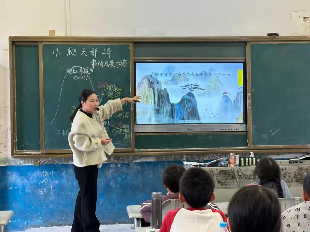 活動中,陳燕燕老師執(zhí)教四年級《爬天都峰》,以圖片、言語創(chuàng)設(shè)情境,引導(dǎo)學(xué)生體悟天都峰“高陡”與攀登“辛苦”,通過扎實的“三筆一畫”功底,以簡筆畫活化山形、板書梳理文脈,將教學(xué)藝術(shù)與思維訓(xùn)練有機融合。彭夢霞老師在六年級《只有一個地球》課堂上,緊扣“抓住關(guān)鍵句把握主要觀點”語文要素,設(shè)計三層遞進式學(xué)習(xí)任務(wù),以評價驅(qū)動思維深化,同時將環(huán)保教育與立德樹人理念自然滲透,讓學(xué)生在文本品讀中樹立地球家園保護意識。