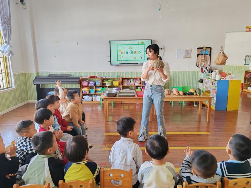 活動伊始,形態(tài)各異的南瓜成為“自然教具”。孩子們圍攏觀察,通過輕嗅、觸摸分享發(fā)現(xiàn):“南瓜聞著香香的”“皮摸起來糙糙的”。在老師引導下,大家對南瓜建立初步認知,為制作環(huán)節(jié)積蓄興趣。