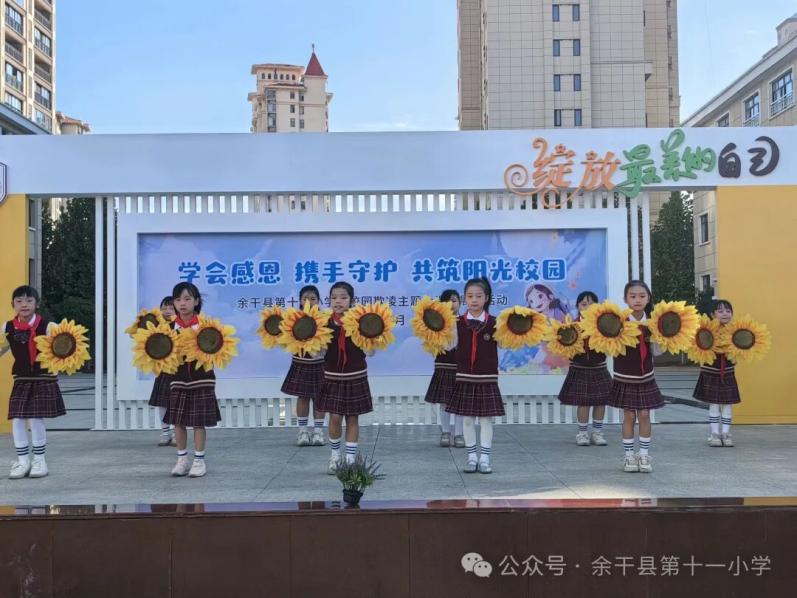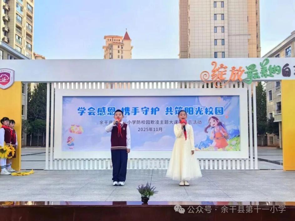 為進(jìn)一步筑牢校園安全防線,營(yíng)造友善和諧的育人環(huán)境,11月12日,余干縣第十一小學(xué)精心組織開(kāi)展“學(xué)會(huì)感恩,攜手守護(hù),共筑陽(yáng)光校園”防校園欺凌大課間展示活動(dòng),讓尊重、友善與勇敢的種子在孩子們心中生根發(fā)芽。